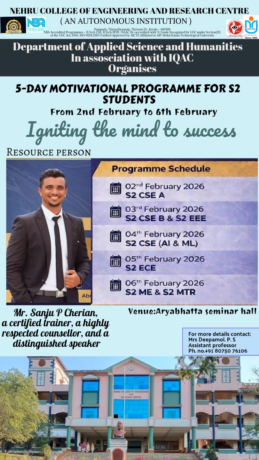 The Department of Applied Science and Humanities at NCERC, in association with IQAC, conducted a 5-Day Motivational Programme for S2 students from February 2 to February 6, 2026, at Aryabhatta Seminar Hall. The sessions were delivered by Mr. Sanju P Cherian, a certified trainer and counsellor, aimed at improving student motivation, confidence, and academic performance. Students from multiple departments actively participated in the programme.