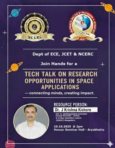 The Department of Electronics and Communication Engineering organized an expert talk on Emerging Trends in Space Technology and Remote Sensing on 10th October 2025. The session was led by Dr. J.K.K., an eminent scientist known for his contributions to space research and education. The objective of this lecture was to expose students to the current developments in satellite technology, miniaturized electronics, GIS, and remote sensing systems that form the foundation of modern communication and geospatial studies.