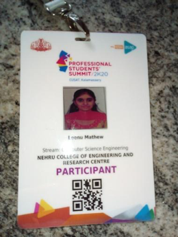 Ms. Leenu Mathew, S6 CSE 2017-21 batch participated in professional student summit 2K20 at CUSAT Kalamassery.
