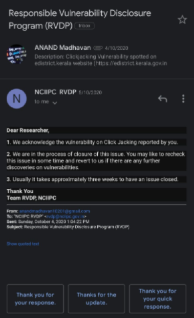 Click jacking vulnerability spotted in edistrict.kerala website reported by s1 cse student Anand M