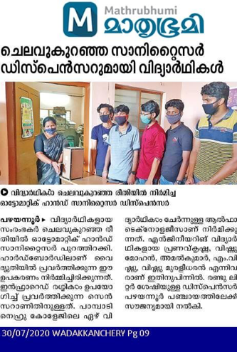 Vishnu Mohanan of S6 CSE B and his team named alpha technologies has developed a low-cost sanitizer dispenser