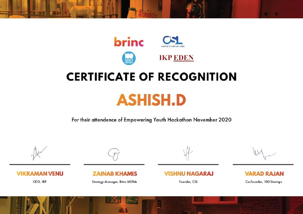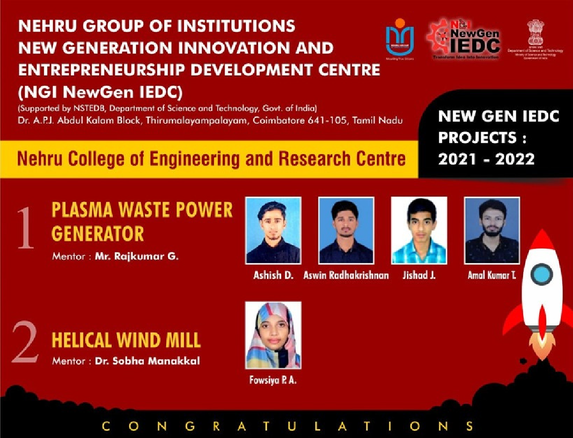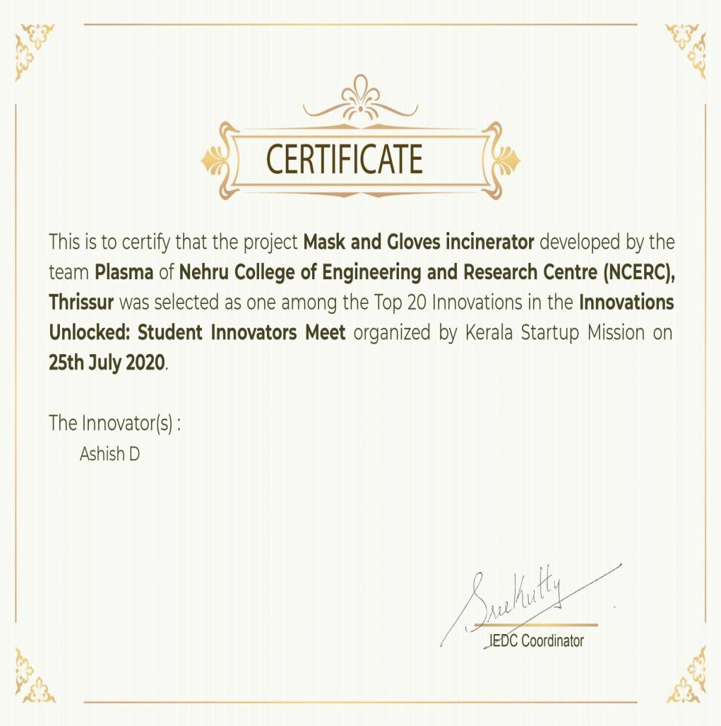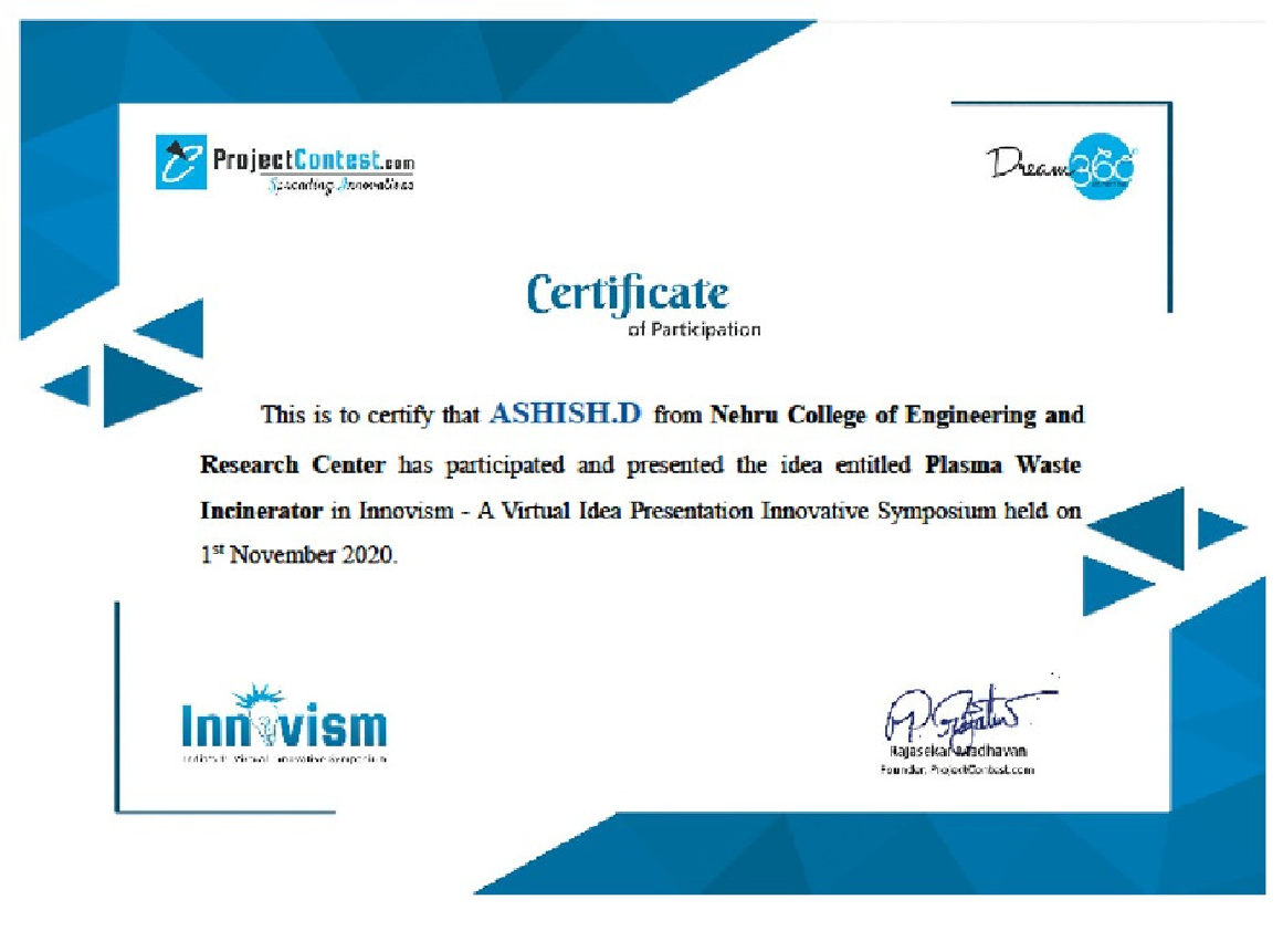 4. Ashish D and Team Plasma of III Year Mechanical Engineering, received certificate from IMIT on 20thFeb 2021, for their innovative project named PLASMA HYBRID ENGINE which has been designed to run in both air and electrical energy as fuel for automobile